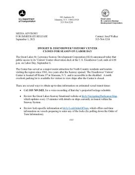 The Great Lakes St. Lawrence Seaway Development Corporation (GLS) announced today that public access to its Visitors' Center observation deck at the U.S. Eisenhower Lock ends at 6:00 p.m. on Labor Day, September 6.